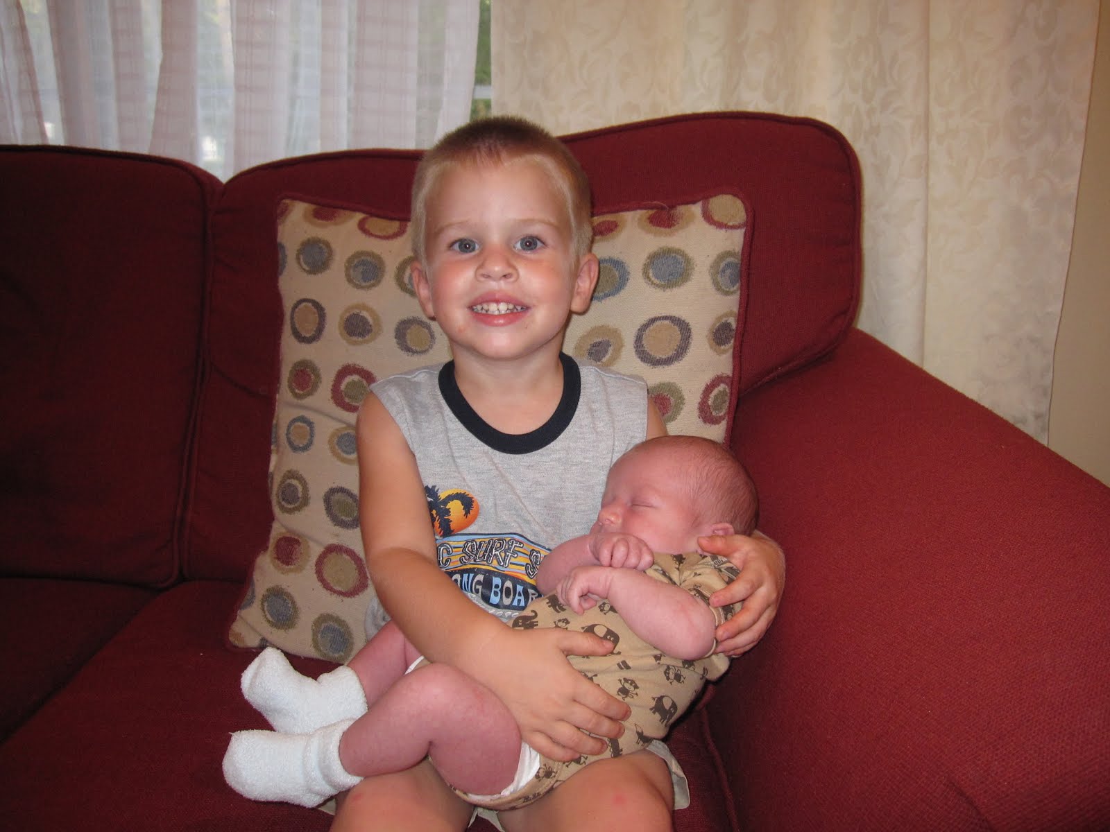 This evening, more than 24 hours after Noah's fever broke, we are babysitting Brianne and Titus. I asked if Noah could hold Titus, and he was given the All Clear! I thought Noah might jump out of his skin in excitement!! So before Matt and Jen could even pull out of the driveway, there was Noah FINALLY holding baby Titus.